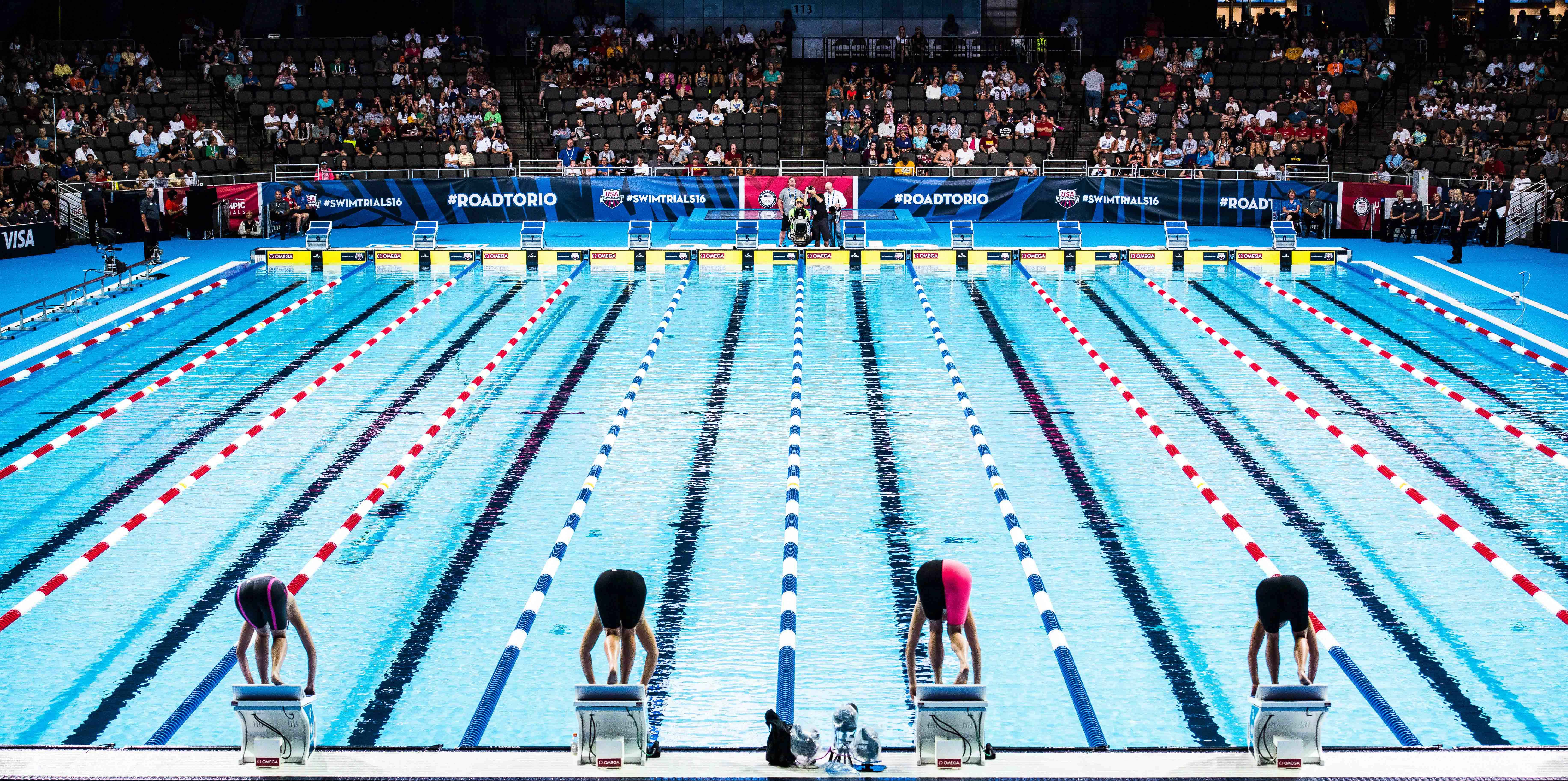 Faszination US Trials: Die US Trials waren die wohl imposanteste und unterhaltsamste Schwimm-Veranstaltung, die wir je besucht haben. P.S.: Man beachte die Leinen in US-Farben mit blauen 5m-Bereichen.