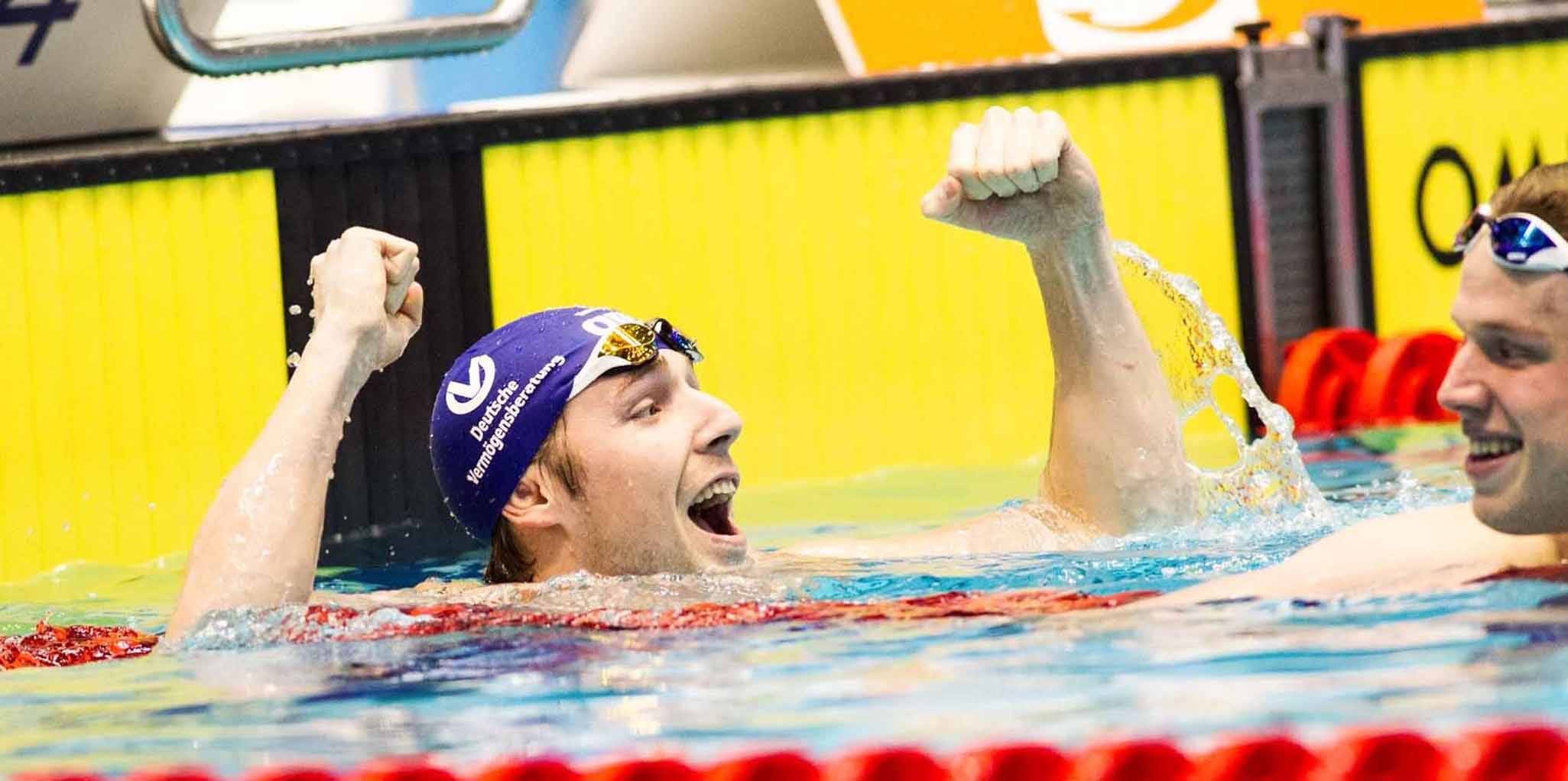 Weiter ging es dann bei den Kurzbahn-Weltmeisterschaften: Hier schnappte sich Koch nicht nur den Titel über die Paradestrecke 200m Brust sondern wurde überraschend auch Weltmeister über die 100m-Strecke.