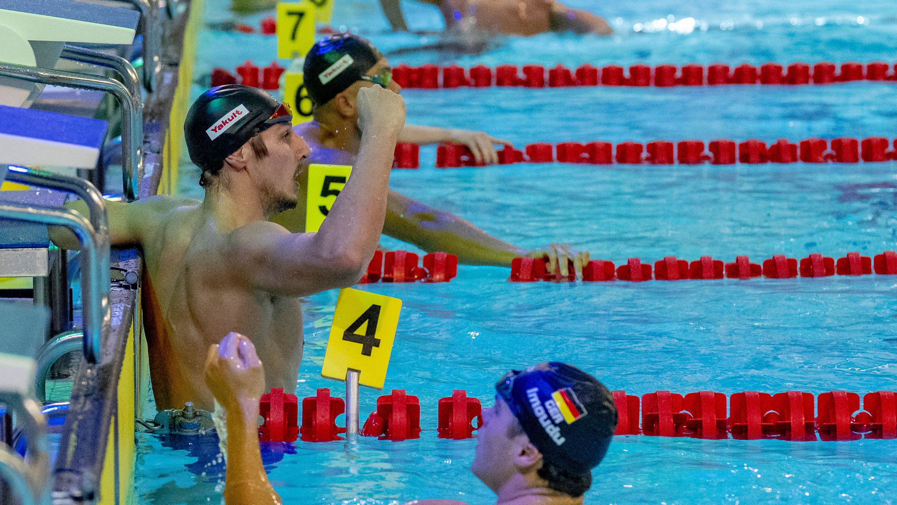Direkt im ersten Finalabschnitt der Deutschen Kurzbahnmeisterschaften in Wuppertal stand ein erstes Highlight auf dem Wettkampfprogramm. Über die 100m Brust lieferten sich Lucas Matzerath (SG Frankfurt) und Melvin Imoudu (SC Potsdam) ein hochklassiges Duell, bei dem am Ende Matzerath in 57,83 Sekunden die Hände zuerst an der Wand hatte. Imoudu schwamm in 58,29 Sekunden zu Silber, während sein Teamkollege Malte Gräfe (58,83) sich über die Bronzemedaille freuen durfte.