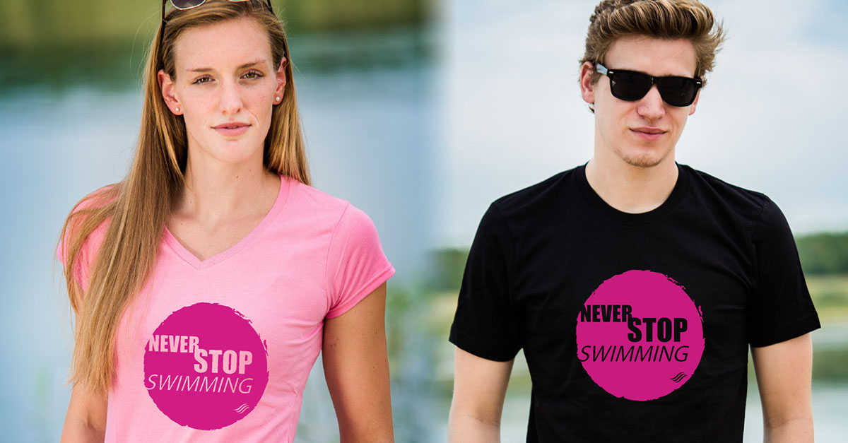 In unserem swimsportStyle-Shop bieten wir euch tolle Shirts und Pullover mit Motiven und Sprüchen für Schwimmer. Seit kurzem gibt es einen bunten Neuzugang: Das Never-Stop-Swimming-Motiv setzt Farbakzente und ist schnell zu einem der beliebtesten Shirts bei uns aufgestiegen. Hier könnt ihr es bestellen: