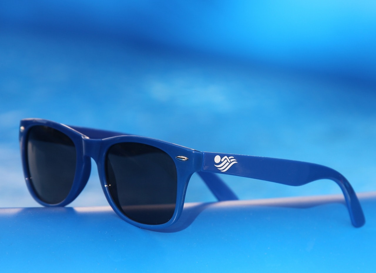 blaue Sonnenbrille mit kleinem Schwimmer-Motiv